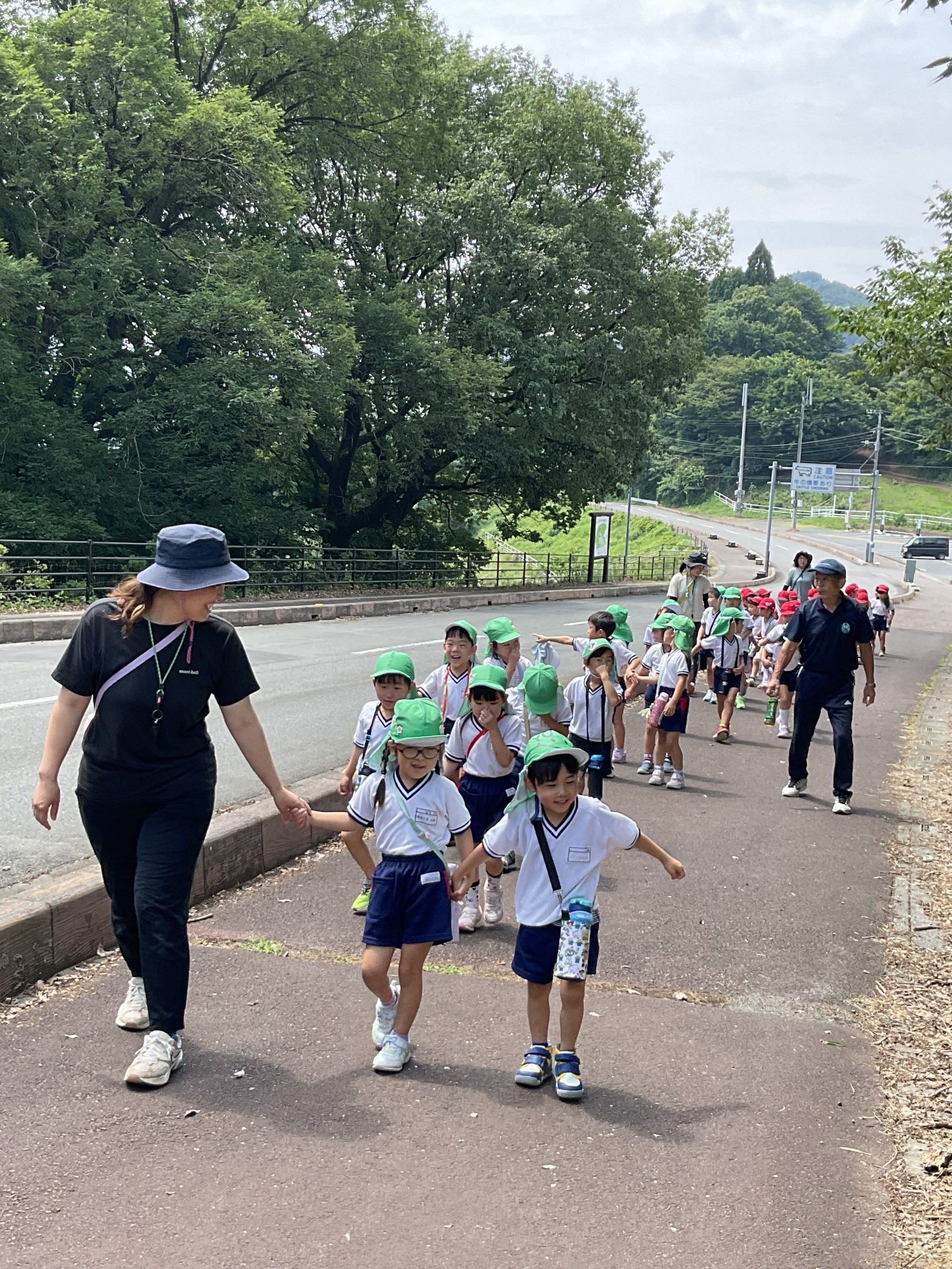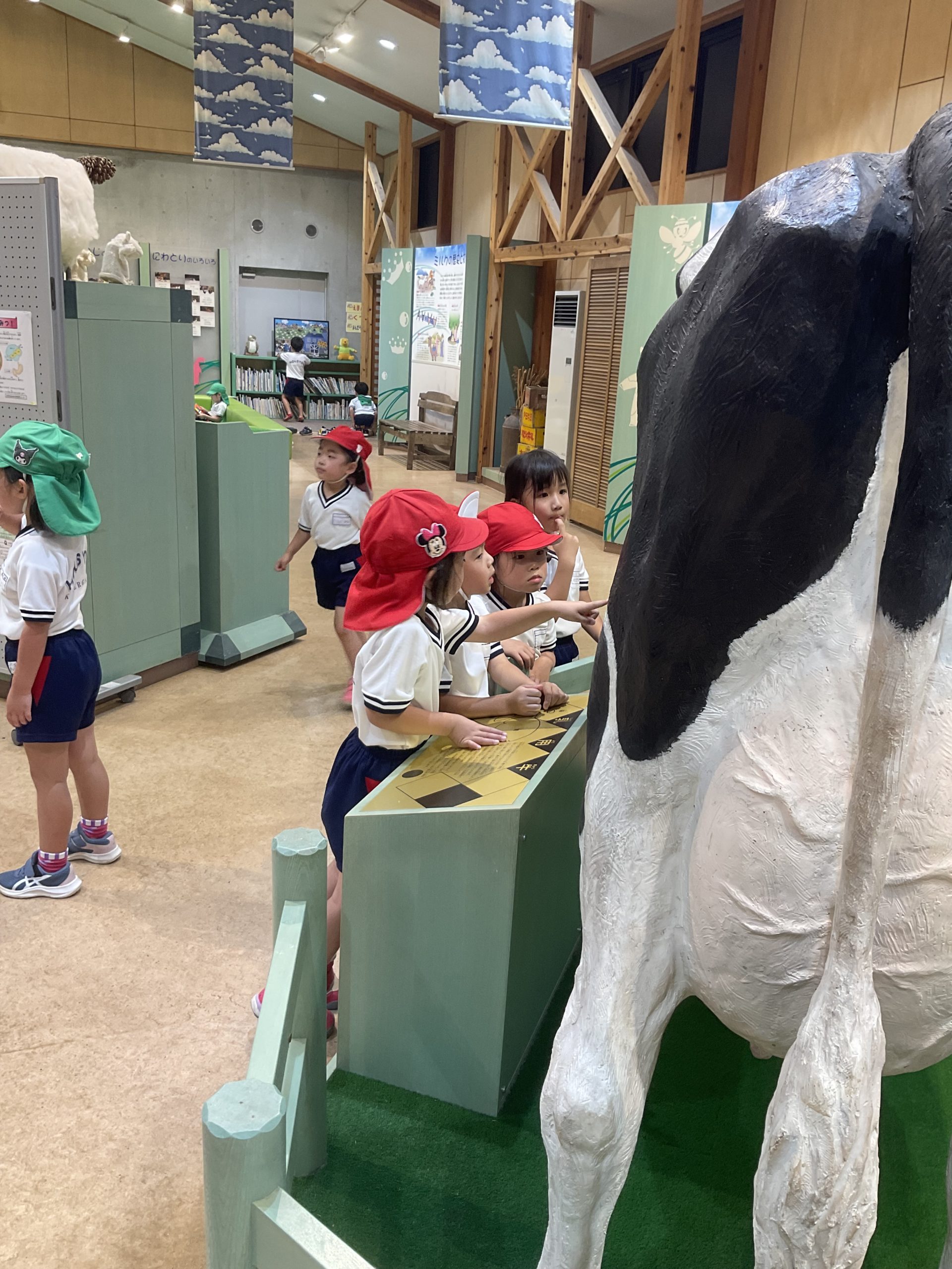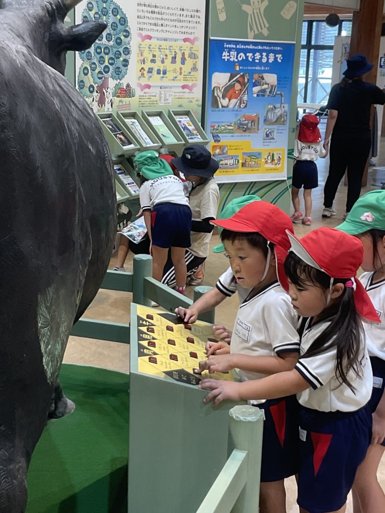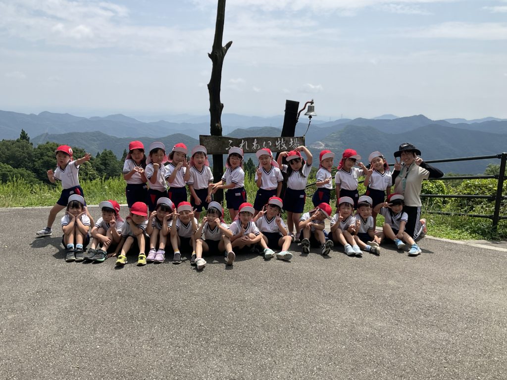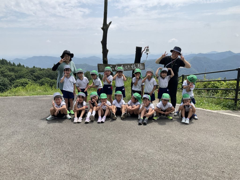 先日、年長組は高原牧場に出かけてきました。朝は雨が降っていましたが、出かける頃にはすっかりいいお天気になりとても暑い日となりました。山の上に着くと、牛さんがお出迎え。子どもたちが『モ〜、モ〜』と呼びかけると牛さんも『モ〜』と答えてくれました。かわいい🩷ウサギさんにも会えました。ヤギさんとは触れ合う事ができました。ヤギさんの首には名札がついていて、その名前を呼んで声をかけたり、優しく撫でてあげたりしていました。中にはやぎさんが近寄って来ると『キャー!』と逃げ回る子も…。久しぶりの園外保育。とてもいい体験ができました。