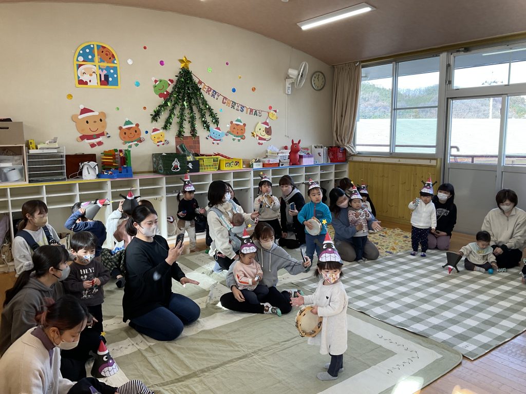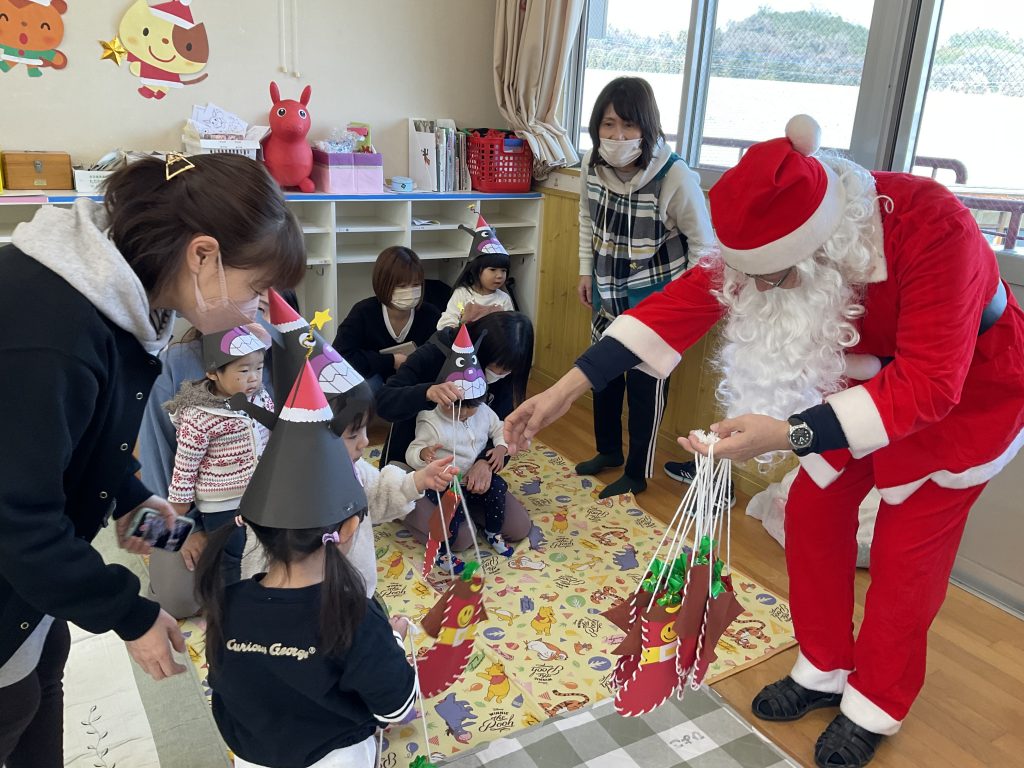 昨日、おひさまくらぶでは、ひと足先に『クリスマス会』を行いました。バイキンマンの三角帽子を被り、ジングルベルの曲にのって、楽器を鳴らしてみたり、みんなでクリスマスプレゼン交換をしたりしました。サンタクロースも、素敵なプレゼントを持って登場。かわいい子ども達は、目をキョトンとし、サンタさんを見つめていました。