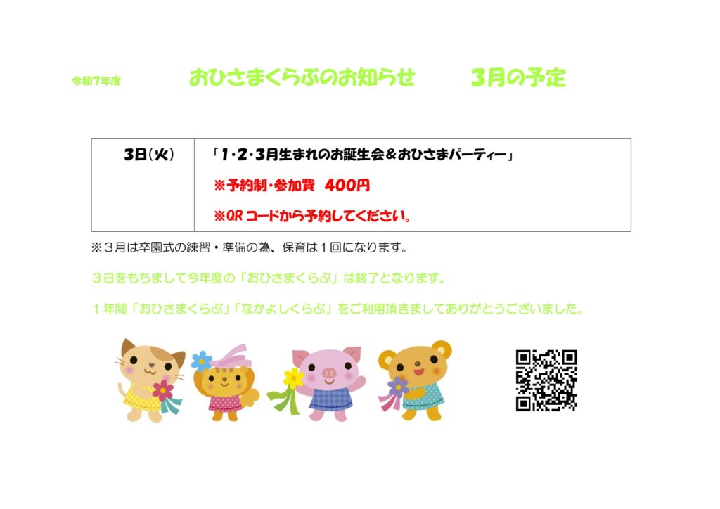 おひさまくらぶも今年度も残り1回となりました。3月のおひさまくらぶの予定をお知らせいたしますので、みんなで楽しくパーティーを開催しましょう。